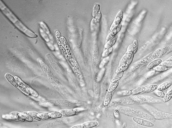 ◦ 자낭균에 속하며, 자낭은 곤봉형, 무색, 크기 60~83×10~15㎛, 자낭포자는 타원형, 무색, 2세포, 크기 15~20×6.7~7.3㎛임