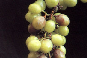 ◦ 송이축이 부분적으로 마르고 과실의 생육은 현저하게 불량하게 되며, 병든 과실은 부패되지 않고 검은 보랏빛으로 건포도처럼 되어 과방에 잔류