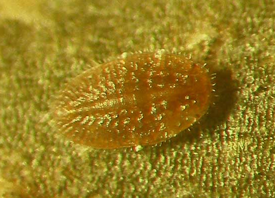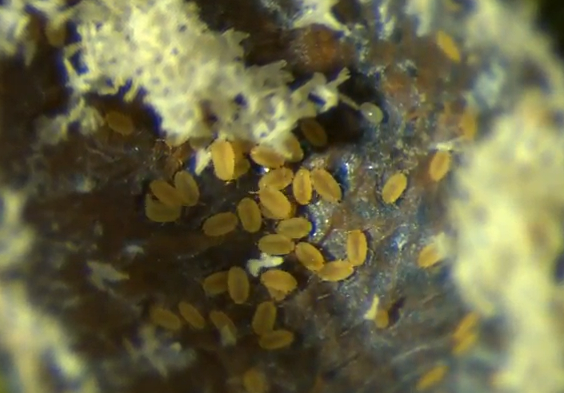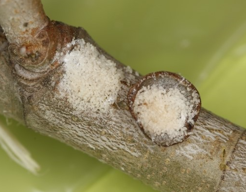 ◦ 미성숙한 깍지는 등면이 황갈색으로 검은색의 작은 반점이 산재해 있고 백색의 분말로 위장하고 있음