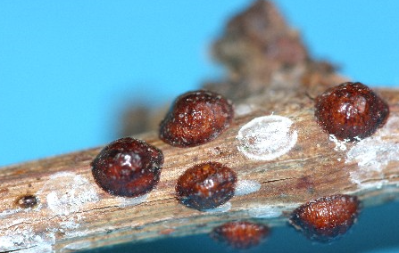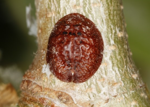 ◦ 암컷 성충의 갈색을 띠며, 타원형 또는 반구형으로 크기는 4~6mm 정도임
