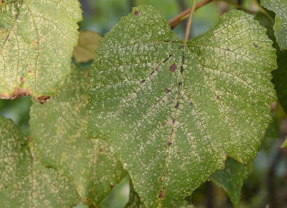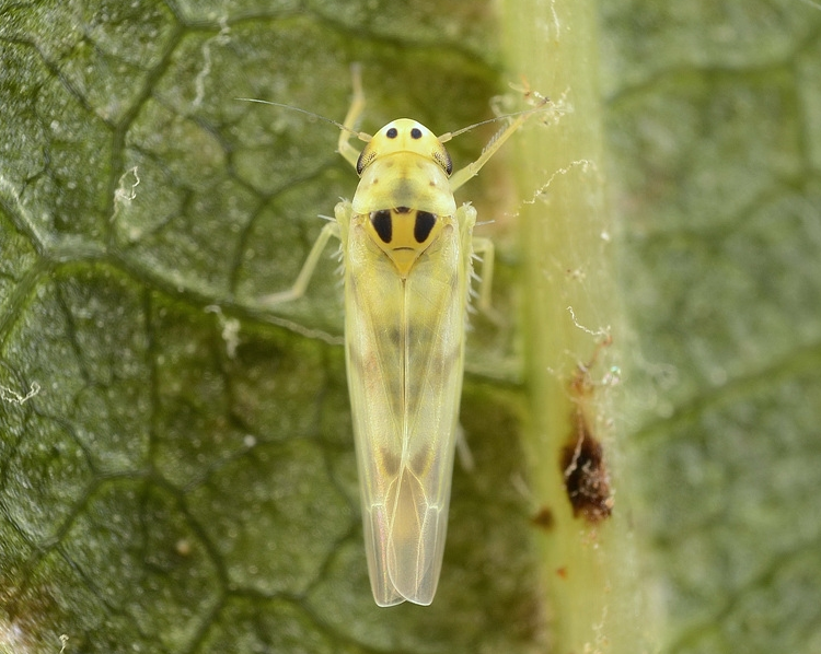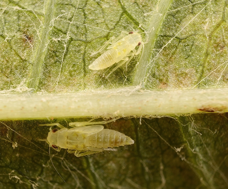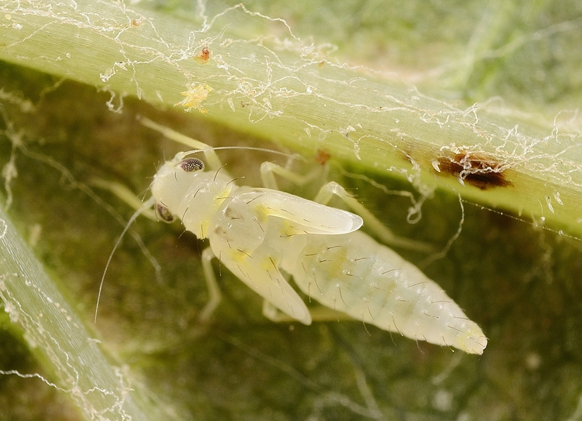 ◦ 성충과 약충이 잎의 뒷면에서 흡즙, 잎 전체에 작은 반점이 나타나기 시작하여 점차 녹색을 잃고 표면이 회백색으로 됨