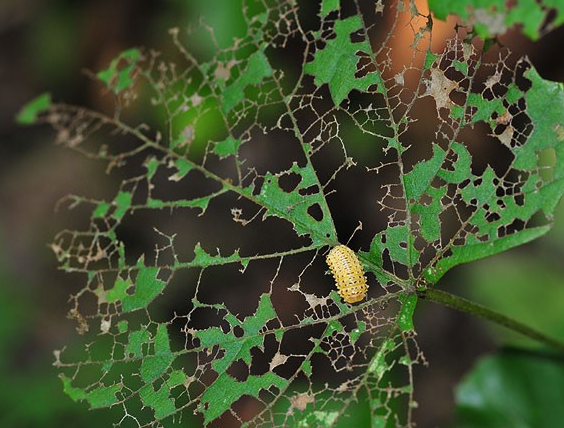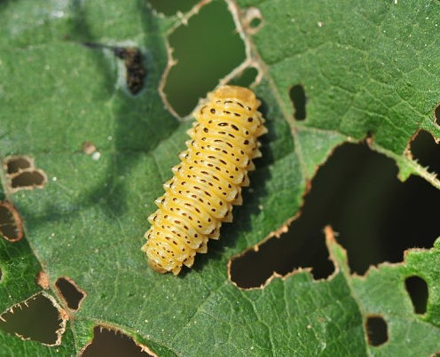 ◦ 유충은 잎 표면이 이면을 가해하고 발육기간은 평균 23일이며, 3회의 탈피를 거쳐 종령이 된 후 땅 속에서 흙으로 방을 짓고 그 안에서 용화함