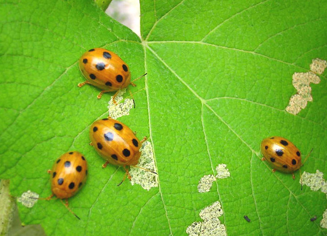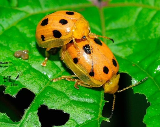 ◦ 몸은 황갈색을 띠고 더듬이는 흑갈색이며, 딱지날개의 위쪽에는 5쌍의 둥근 검은색 무늬가 있음