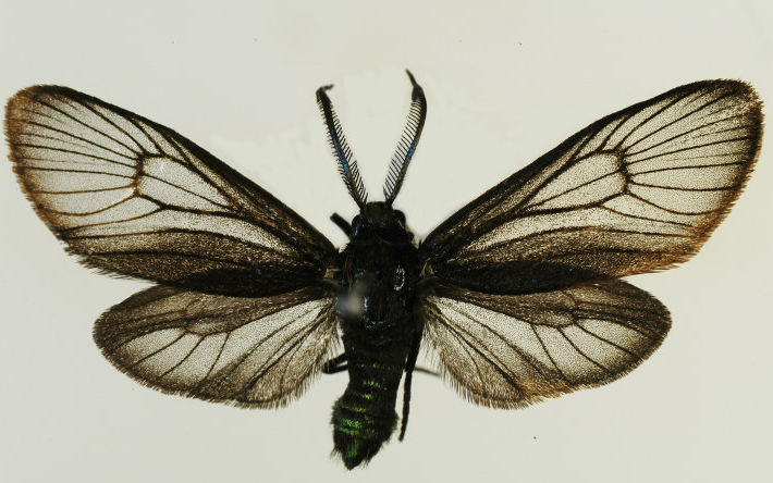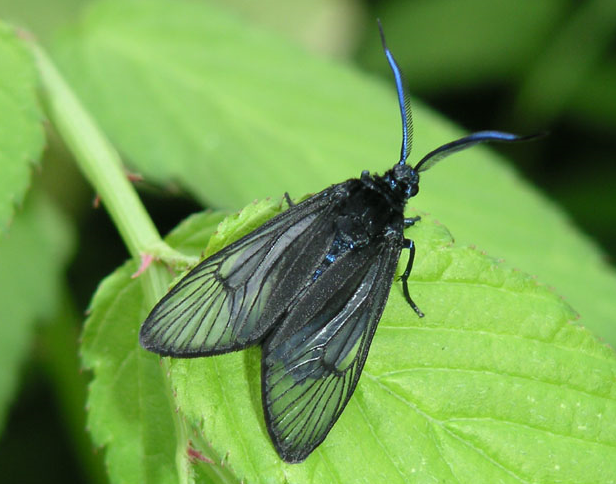◦ 성충은 날개편길이 28~30mm 정도로 더듬이는 수컷이 빗살모양이고 암컷은 실모양이며, 몸과 날개의 바탕색이 흑색이고 몸에는 청람색의 광택이 남