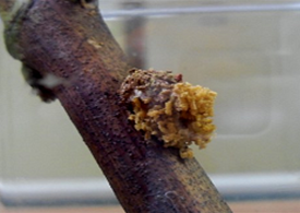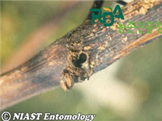 ◦ 유충이 새가지 속을 파고 먹어 들어가며, 유충이 들어 있는 부분은 줄기가 볼록하게 부풀어 있고 새로 나온 가지 끝이 시들시들 말라 죽음