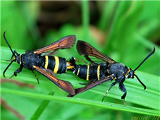 ◦ 성충은 언뜻 보기에 벌과 비슷하게 보이며, 몸은 흑색, 두부, 목, 가슴의 양쪽에 황색반점이 있고 배 끝 몇 마디에 황색 테가 있음
