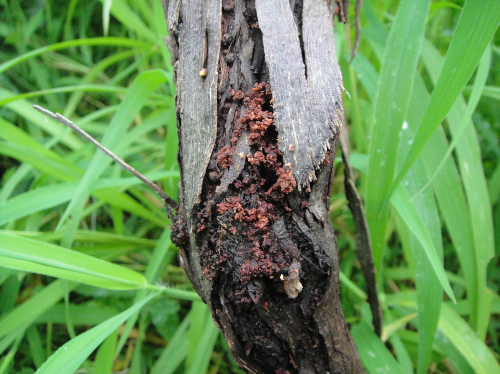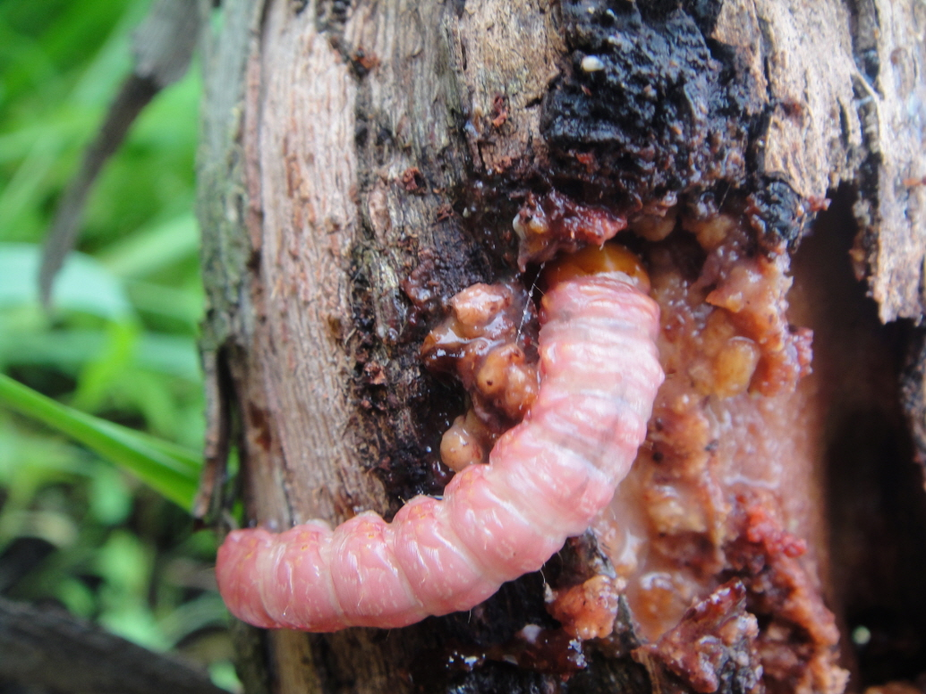 ◦ 유충이 포도나무 주간과 주지 속으로 들어가 형성층(부름켜)을 가해하여 나무의 세력을 크게 떨어뜨리고 심한 경우 나무 전체가 말라 죽음