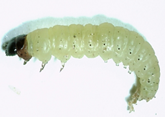 ◦ 유충은 머리가 갈색이고 몸은 유백색이며, 몸 마디마디에 갈색의 작은 점무늬가 널려져 있음