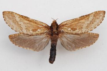 ◦ 성충은 34~45mm 정도로 큰 나방으로 몸과 날개는 갈색이고 몸은 가늘며 길고 앞날개에 황백색의 점무늬가 있어 구별됨