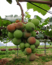 ◦ 과실 온도가 35℃일 때는 3.5시간 40℃일 때는 1시간 만에 증상이 나타나고 직사광선을 받기 쉬운 포도송이 위쪽에 많이 발생되며, 노지에서 재배하는 포도보다 온실 및 하우스 재배에서 많이 발생함