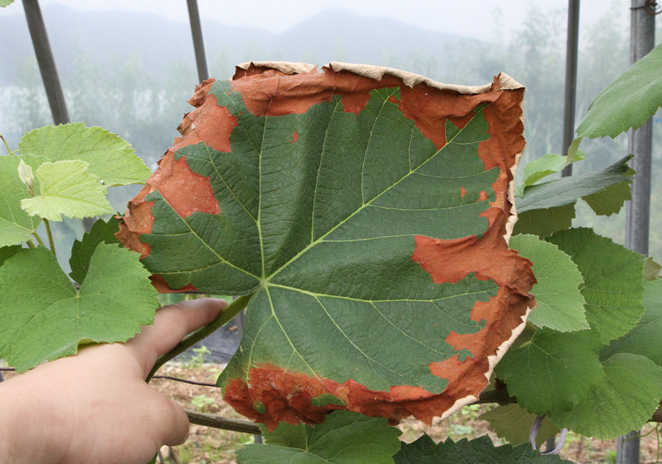 ◦ 약해에 의해 일소가 발생하기도 하는데, 약해를 일으키는 약제는 주로 보르도액과 동 제품으로 보르도액의 경우 석회량이 지나치게 적은 경우 또는 보르도액 살포 후 마르기 전에 비가 오면 석회가 유실되어 유산동이 유출되므로 질소증상이 나타날 수 있음