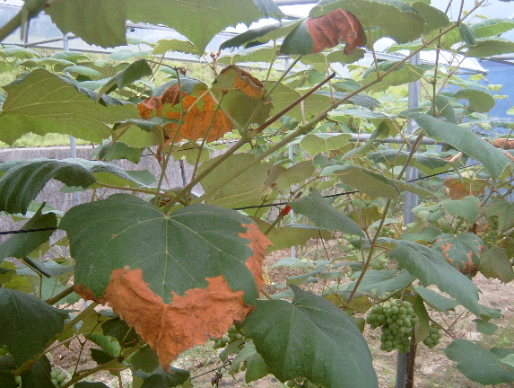 ◦ 일소증상은 직사광선에 의한 고온장해로 토양건조는 포도 잎에 수분 부족 증상으로 나타나며, 장마기에는 수분 과다로 뿌리 발달 및 활력이 떨어지는 반면 신초가 도장하기 때문에 뿌리의 수분 공급이 원활하지 못해 발생함