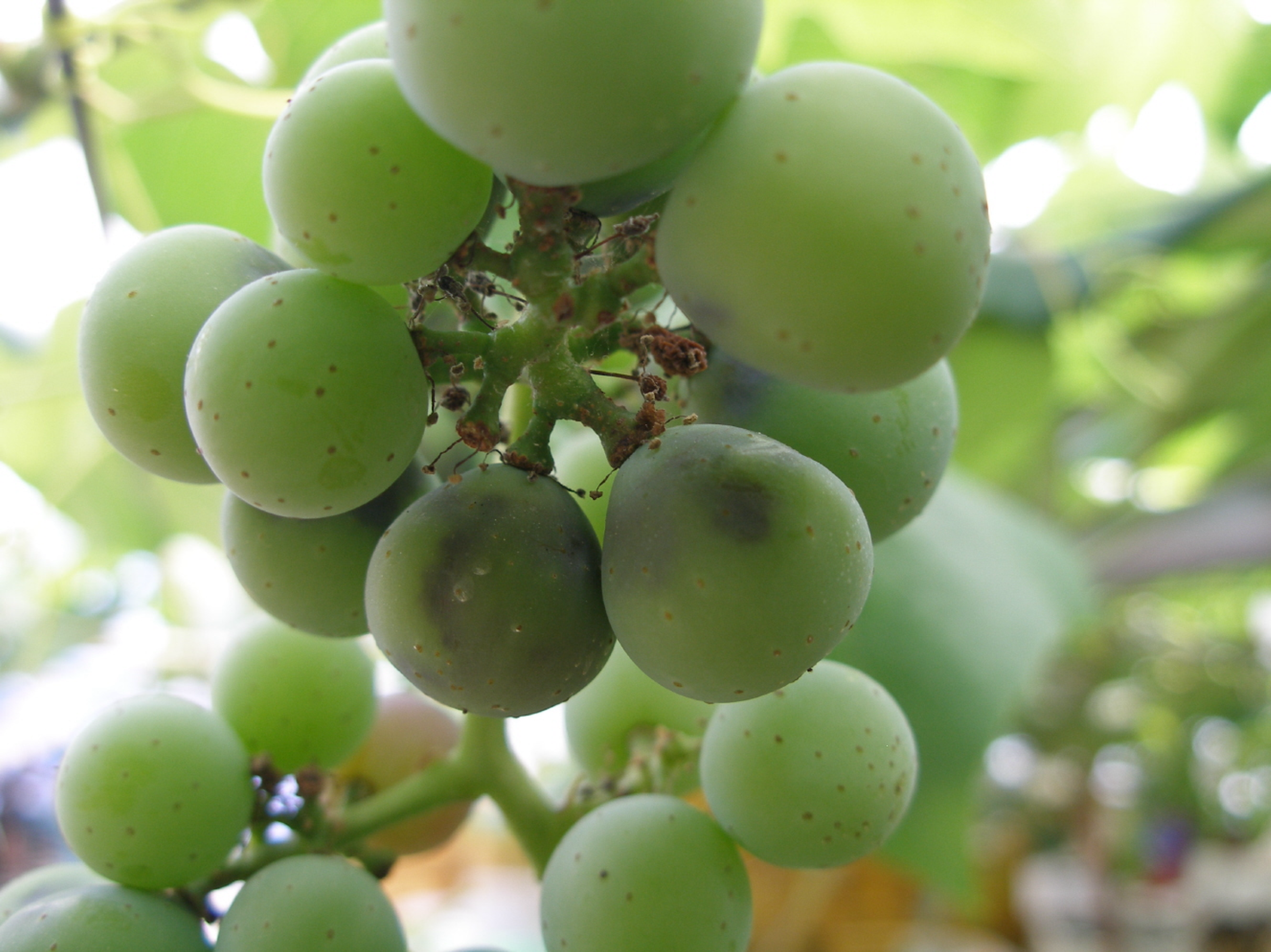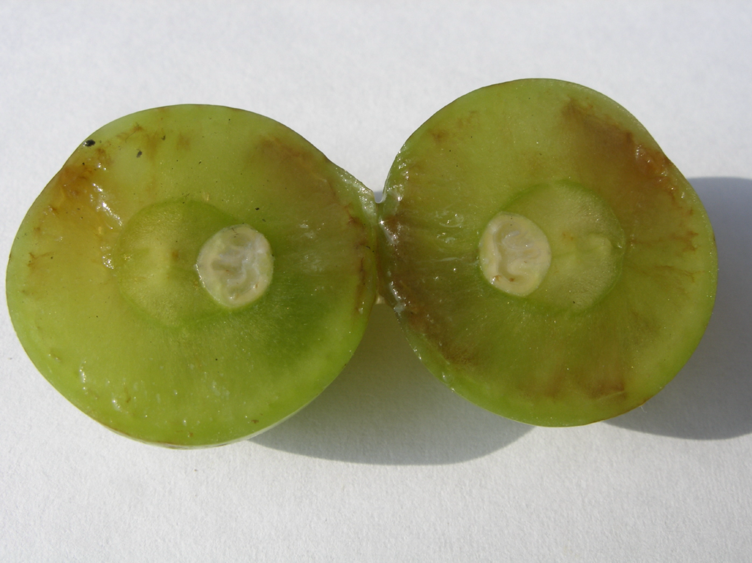 ◦ 포도알 속이 검어지는 현상으로 씨가 단단하게 여무는 경핵기 무렵부터 씨 둘레의 과육이 갈색으로 변하며 코르크화 되어 상품가치가 전혀 없어짐