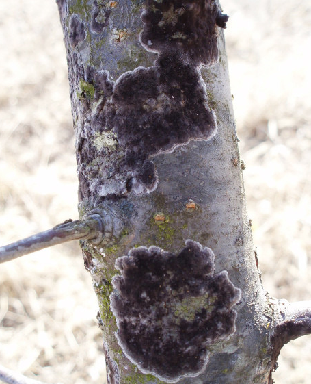 ◦ 줄기와 가지에 고약을 붙인 것처럼 갈색 내지 암갈색의 균총이 붙어 있으며, 심하게 감염된 가지는 말라 죽음