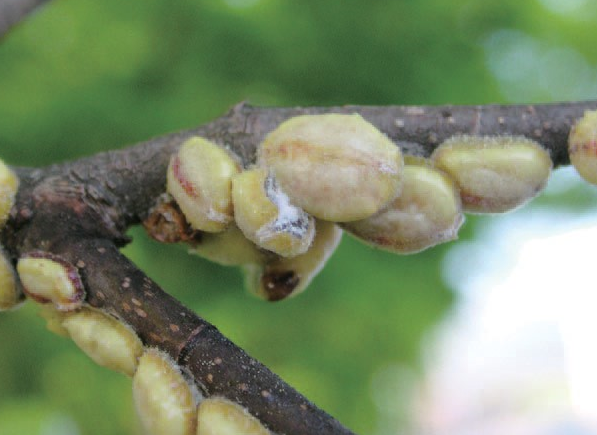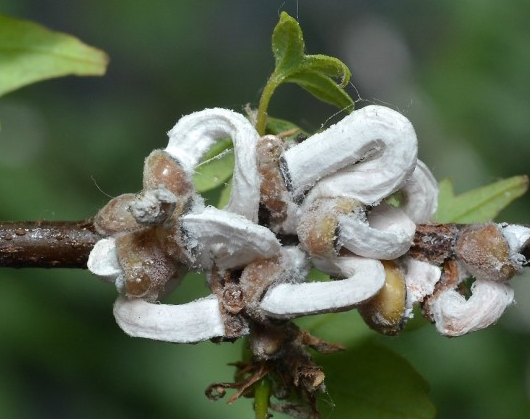◦ 가지나 잎에 기생하여 흡즙 가해하며, 피해를 심하게 받은 가지는 고사함