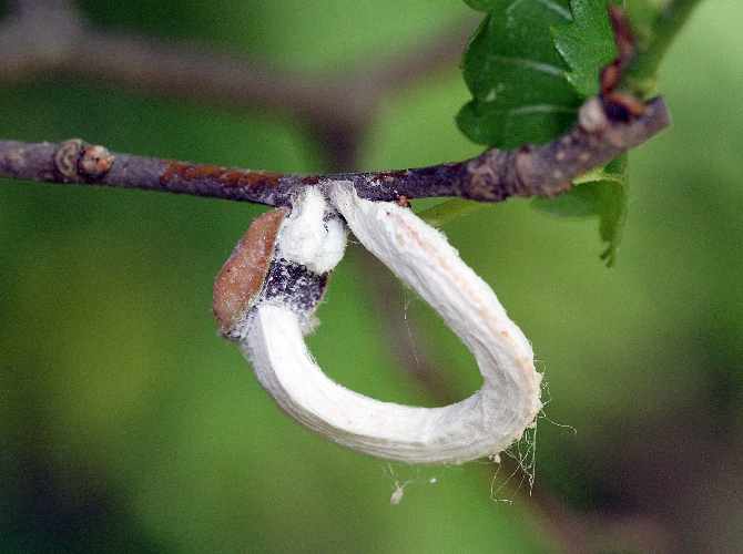 ◦ 몸에 약간의 흰가루를 분비하나 산란이 끝나면 암갈색으로 변하며, 알주머니는 백색의 긴 고리모양임