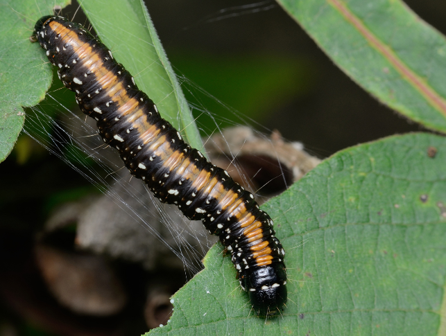 ◦ 유충은 36mm 정도로 적색을 띤 등색이며, 암갈색의 넓은 띠가 있고 그 안에 흰 점이 산재함