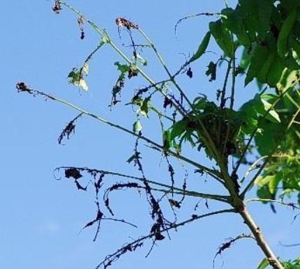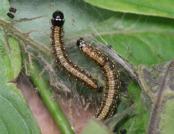 ◦ 잎 표면에 무더기로 산란된 알은 약 11일 후에 부화하고 유충은 거미줄로 잎을 말고 군서하면서 식해하고 9월 중순경부터 땅으로 내려와 흙 속 1cm 정도에 편평한 타원형 고치를 만듦