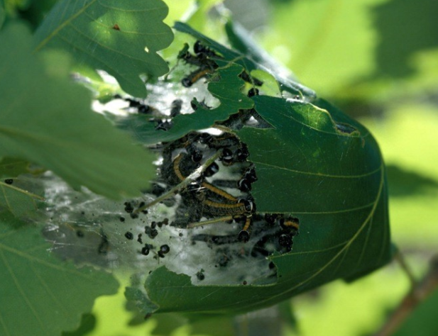 ◦ 어린 유충은 집단을 이루어 거미줄로 잎을 말든가 두 잎을 겹치게 한 후 잎살만 식해하나 성장하면 집단이 이동하면서 여러 잎을 철하고 식해함