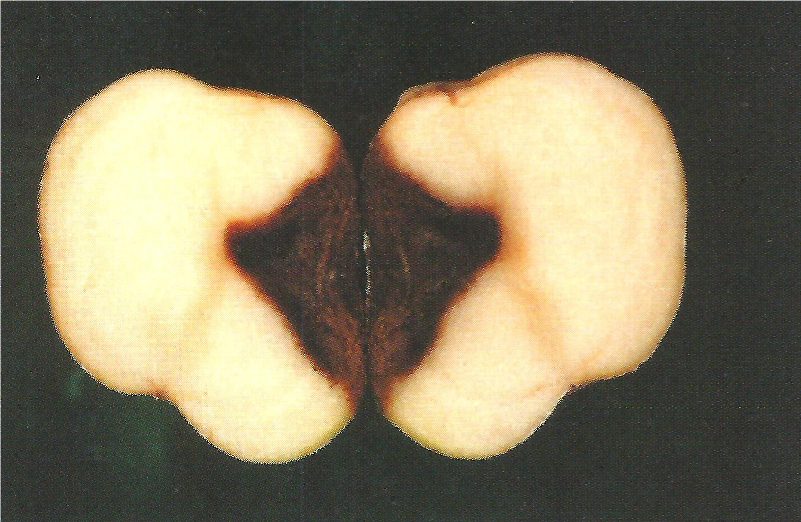 ◦ 괴경 내부는 감염부위가 암갈색 내지 흑색으로 변하고 마른 상태로 썩으며, 병반부위에는 흰 균사와 황색 내지 분홍색의 포자덩어리가 형성됨