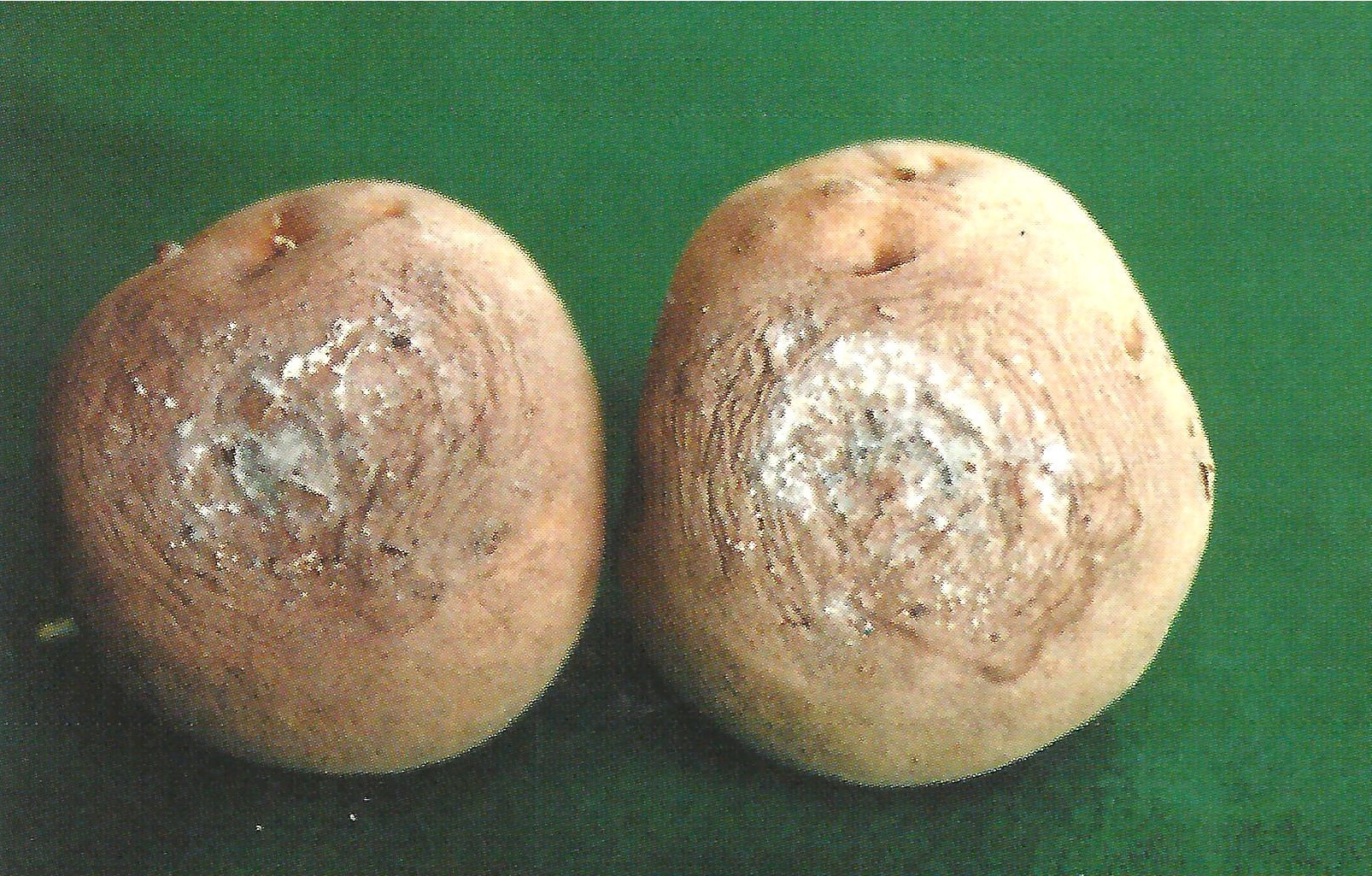 ◦ 병 발생 초기에는 괴경 표면의 상처부위에 작은 갈색 병반이 생기고 암갈색의 함몰증상이 나타나며, 진전되면 죽은 조직이 건조되고 동심원상으로 마르면서 주름이 생김