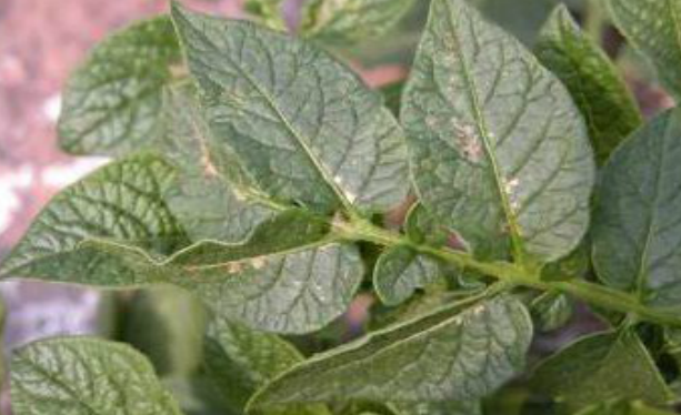 ◦ 잎에서의 피해는 처음에는 엽맥을 따라서 반진반질하거나 하얗게 탈색되는 증상을 보이며, 점차 잎 전체적으로 변색됨