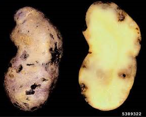 ◦ 감염된 감자는 초기에 작은 흰색 반점으로 나타나고 점점 커져 회색 혹은 흑색으로 변하게 됨