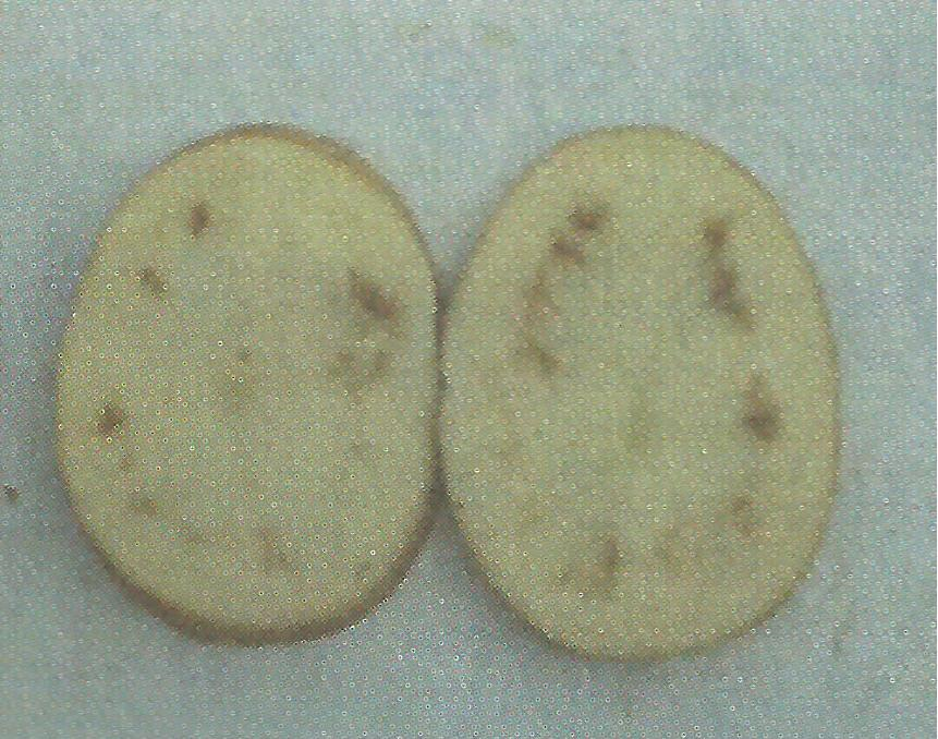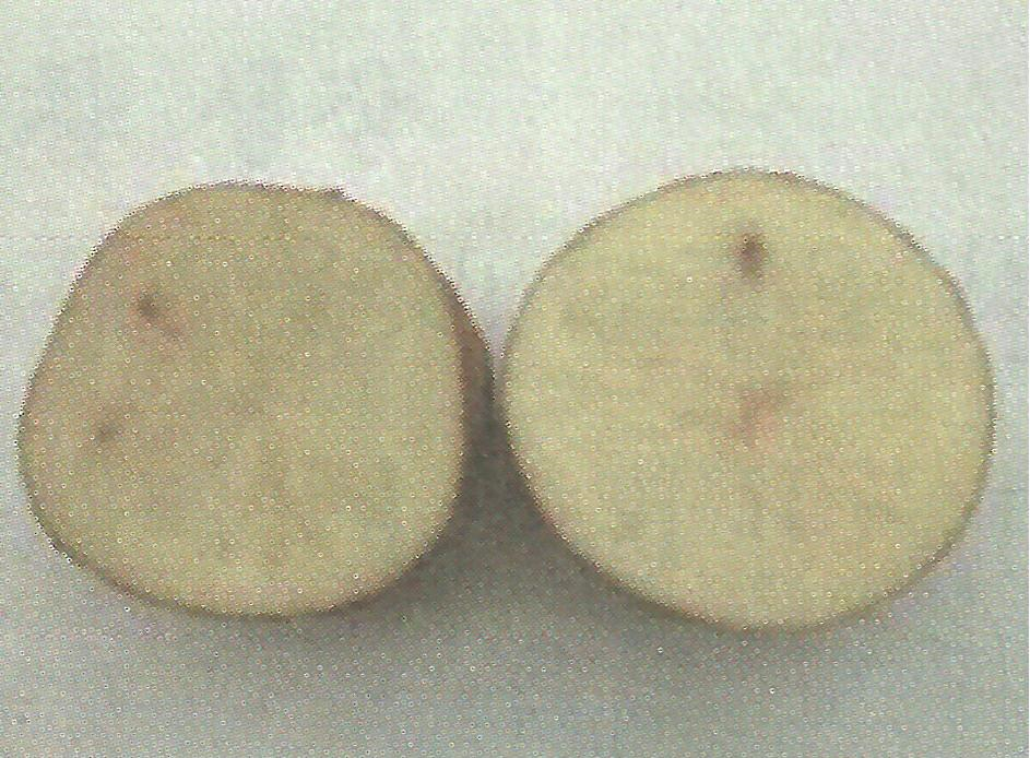 ◦ 변색부위 세포는 죽어서 코르크 상태가 되는데 이 부분은 전분립이 거의 소멸되어 비중이 낮아지고 식용으로도 곤란하며, 큰 감자에서 많이 발생함