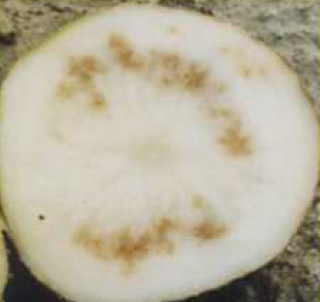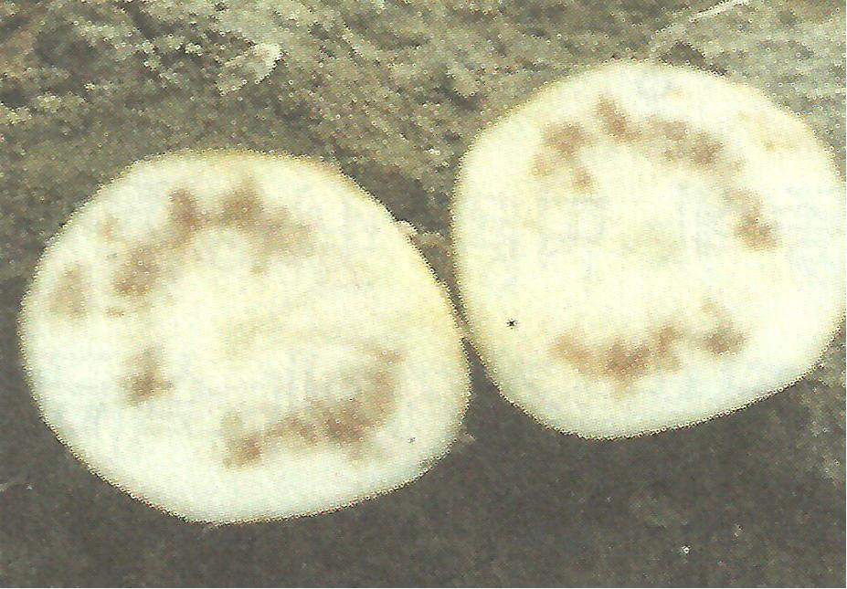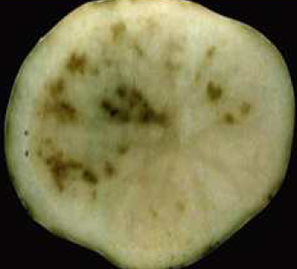 ◦ 생육기간 중 어느 때나 발생할 수 있으며, 괴경비대 직후나 활발한 비대기 동안에 흔히 발생하는데 괴경 표면에는 증상이 거의 없고 감자를 잘라보면 크고 작은 불규칙한 갈색반점이 다수 산재되어 나타남