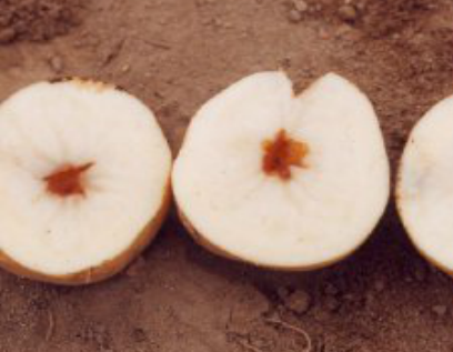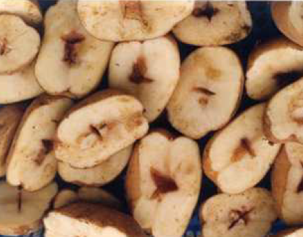 ◦ 주로 전분함량이 많은 가공용 감자품종이나 하령 등에서 많이 발생하는데, 괴경을 잘랐을 때 공동의 내부의 벽은 희거나 엷은 황갈색인 경우가 많음