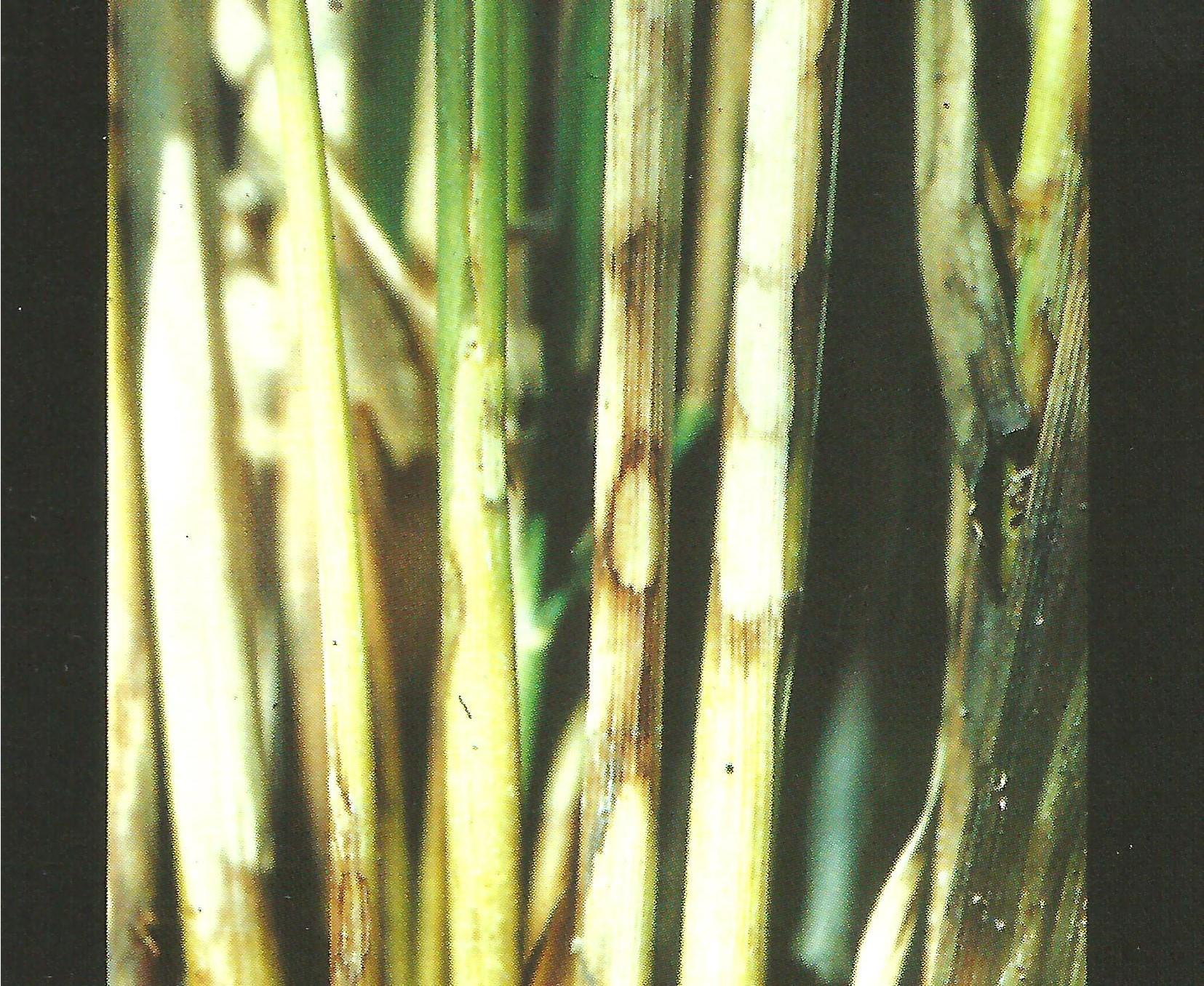 ◦ 병이 진전되면 병반들이 융합하여 커지고 잎집이 마르며, 후에 병반의 이면에는 암갈색 내지 흑색의 원통형 혹은 부정형 균핵이 형성됨