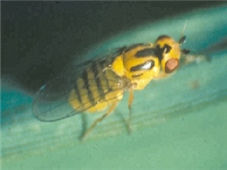 ◦ 성충은 체장 2~2.5mm 내외의 작은 파리로 몸 전체가 황색을 띠나 머리 등면에 검은 반점이 하나 있고 가슴 등판에 3개의 검고 굵은 줄이 세로로 그어져 있으며, 복부 등면에는 가로줄이 있음