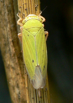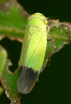 ◦ 암컷 성충은 6mm, 수컷 성충은 4~5mm, 몸은 전체적으로 황록색을 띠나 날개 끝이 암컷은 담갈색, 수컷은 흑색임