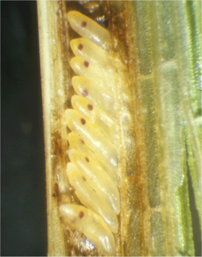 ◦ 발생량이 많을 경우 산란으로 인하여 엽초에 상처가 발생함으로 아래 잎이 고사