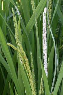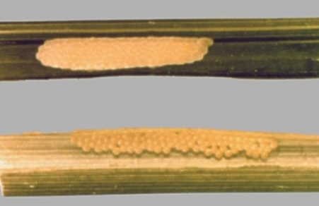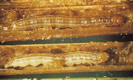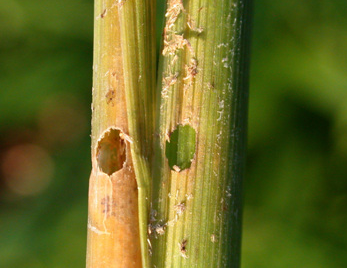 ◦ 2화기 : 유충이 엽초 내부에서 집단적으로 먹어 들어가면 볏대가 누렇게 변하게 되고, 중령유충 이후에는 줄기 속을 가해하여 출수가 안 되거나 백수현상을 유발