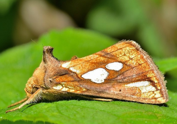 ◦ 성충은 황갈색으로 몸길이 약 15mm, 날개편 길이 25~35mm의 중형나방으로 갈색의 앞날개에 2개의 큰 은백색 무늬가 뚜렷하며, 뒷날개에는 선명한 무늬가 없음