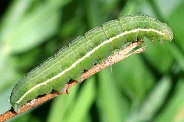 ◦ 유충은 길이 35~38mm 정도로 황록색이고 머리는 광택이 있는 녹색이며, 몸의 폭보다 머리 폭이 가늘고 기문선은 황색으로 넓으며, 복지(배다리)가 퇴화되어 2쌍만 있어 자나방 유충처럼 움직임