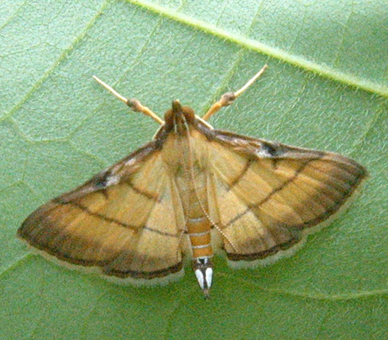 ◦ 성충은 몸길이 10mm, 날개편 길이 17mm 정도인 담황갈색의 나방으로 앞날개에 암갈색 선이 두개 존재하고 수컷은 전연에 암갈색 털로 된 혹이 있음