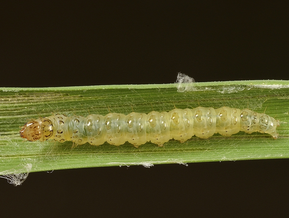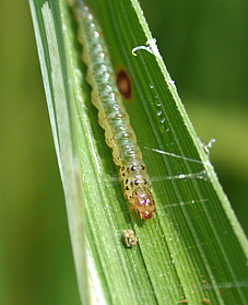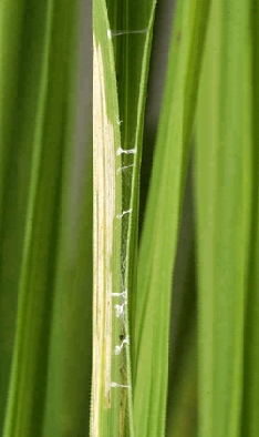 ◦ 유충이 벼잎을 한 잎씩 세로로 말고 그 속에서 엽육을 갉아 먹으며, 피해를 받은 잎은 표피만 남고 백색으로 됨