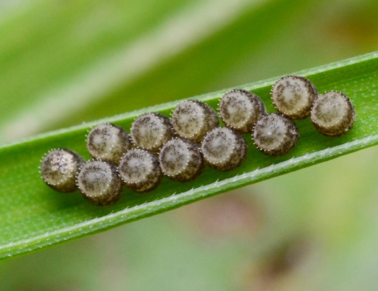◦ 암컷은 1회에 10여개 내외의 알을 벼과 식물의 줄기나 잎에 두 줄로 산란하여 총 200여개를 산란함