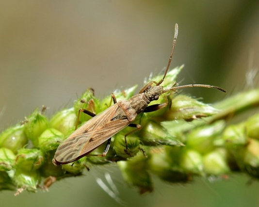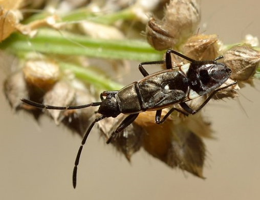◦ 몸길이 7.5mm 정도의 노린재로 몸은 가늘고 길며, 머리와 앞가슴 등판이 검은색을 띠고 개체에 따라 체색변이가 있지만 성충의 날개는 담갈색이며, 날개를 접었을 때 2쌍의 흑색 반점이 날개 가운데 부분에 보임