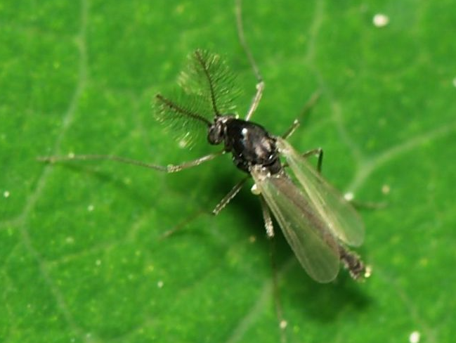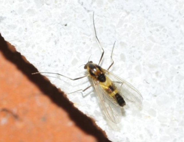 ◦ 성충은 몸길이 약 11mm로 아주 작은 모기처럼 생겼으며, 몸과 다리가 가늘고 길며 머리는 작고 황갈색임