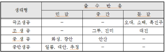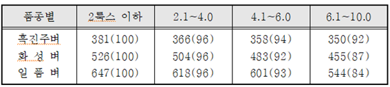 ◦ 생태형별로는 일반적으로 조생종보다 일장감응성이 큰 만생종일수록 출수 지연 정도가 커서 수량 감소가 큰 편이며, 품종별로는 중만생종의 일품벼가 야간의 광에 특히 민감한 편임