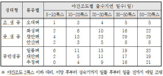 ◦ 야간 조도가 10.1~20.0룩스일 경우 심하게는 출수가 11~13일정도 지연되며, 수량은 감소가 큰 경우 21%정도 감소될 수 있고 청미의 발생이 10% 정도 증가되기도 함