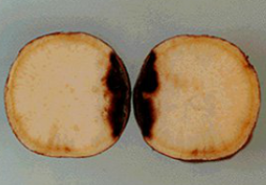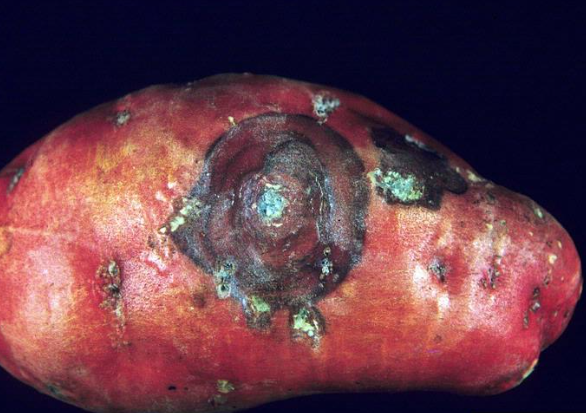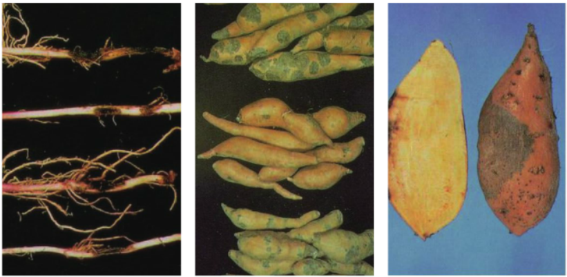 ◦ 괴근에서는 수확기와 저장 중에 2~3cm의 흑색 원형 내지 부정형 병반으로 나타나며, 병반 부위를 잘라보면 괴근 내부까지 검게 변해 썩어 있음