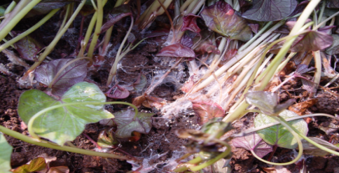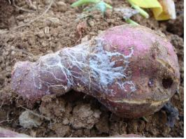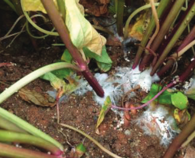 ◦ 고구마 종순 생산 포장 군데군데 불규칙적으로 원형의 움푹하게 고사된 증상이 나타나고 땅가 부위 중심으로 고구마 종순의 지제부가 잘록해지거나 물러지면서 흰색 곰팡이가 펴 시간이 경과되면 명주실 모양의 균사가 엉켜 있음