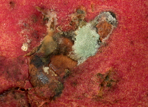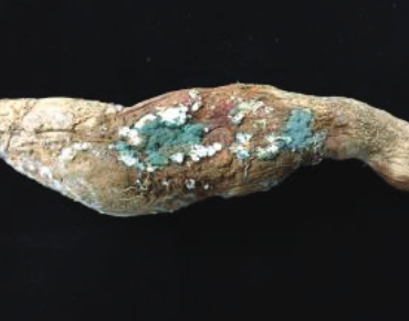 ◦ 병든 조직에 푸른곰팡이가 피는 것이 특징이며, 흰 균사덩어리가 보이기도 하는데 결국에는 푸른곰팡이 포자덩어리가 균사 위에 생김
