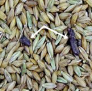 ◦ 전형적인 증상으로 수확 전 이삭에서 씨알 대신 검은 자주색의 흑색 균핵 덩어리가 나타남