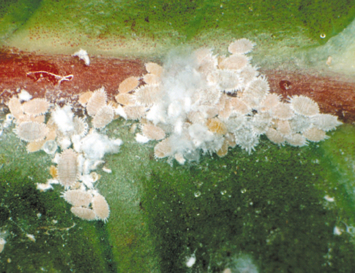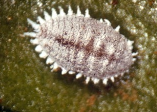◦ 암컷 성충은 타원형으로 2.5~4.5mm, 체색은 황갈색이며, 흰가루로 덮여 있고 몸 주위에는 18쌍의 왁스 분비물이 붙어 있음
