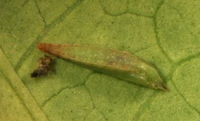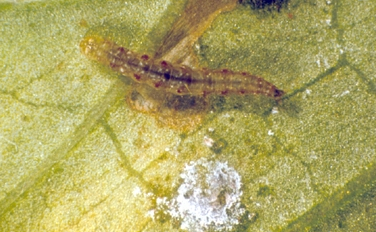 ◦ 다 자란 유충은 6~7.5mm로 머리는 다소 편평하고 반투명한 연한 녹색을 띠며, 복부는 연한 녹색이고 앞에서부터 점차 폭이 넓어져 제3~6마디가 가장 넓으며, 각 마디마다 흰색과 붉은색의 무늬가 있음